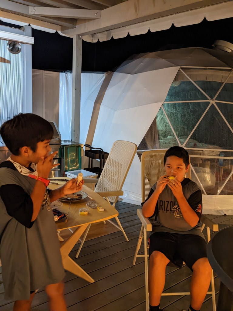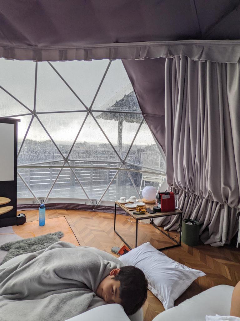 The first 2 days, we see nothing but clouds, we would wake up on rains falling on to our “tent” the sound is so beautiful, we cannot go out of the Glamp site, the nearest restaurant is quite a walk. On a rainy day is not pleasant and our tent is so comfy we just want to stay in. So here we are chomping on our favorite dishes from the convenience store 🙂 thank you to Monopoly for an all day fun!