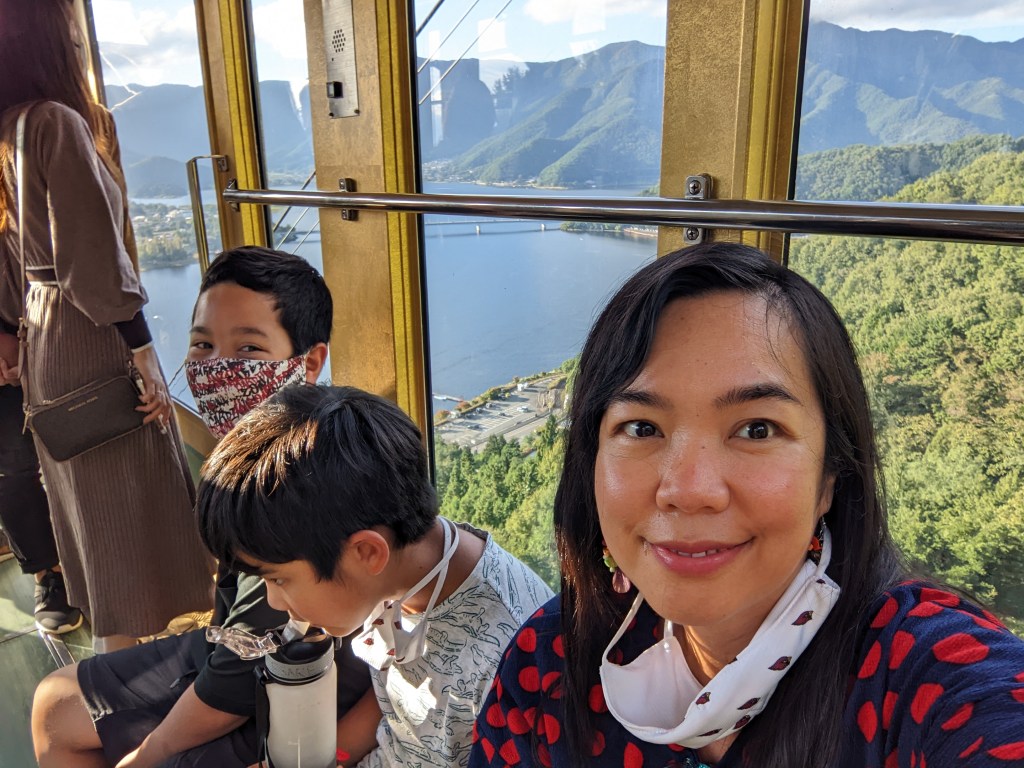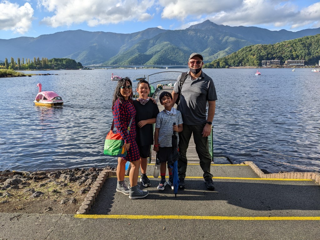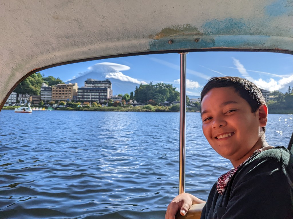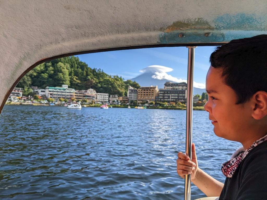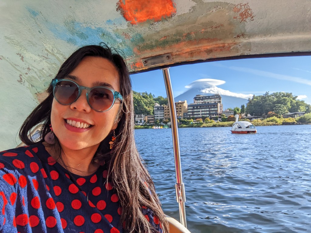 By the time we got to the lake the clouds had cleared around the lake, did the touristy thing of riding a pedal boat with Mt. Fuji in the horizon. how cute is this!